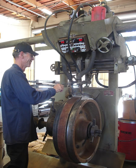 R.J. Kates under took a retro-fit of this welding system used to add metal to bulldozer idler rollers that have worn down by caterpillar treads. A submerged-arc is employed in the welding process and R.J. Kates built a semi-automated process to manage the welding unit.