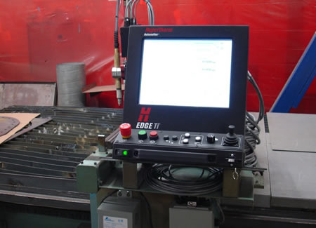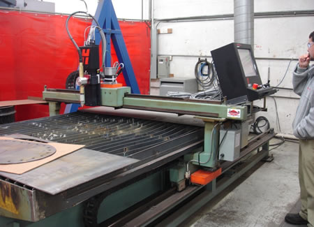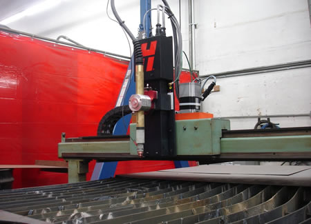The following images show an R.J. Kates retro-fit of an older Lockformer/Vulcan cutting machine. The machine was stripped; then the drive package, control systems and plasma heads were replaced with new Hypertherm equipment.